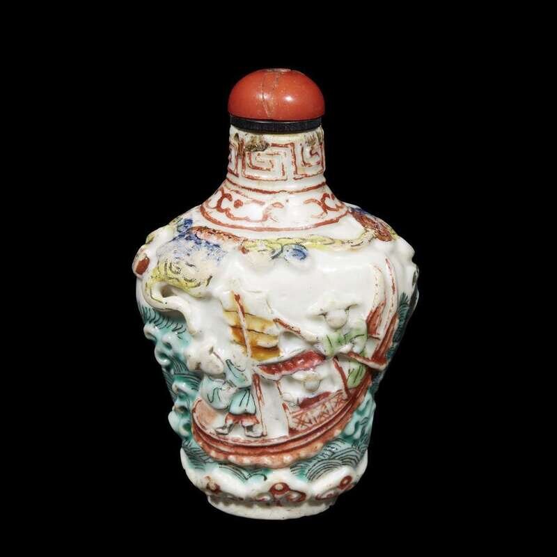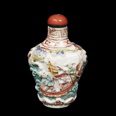 A Chinese Canton enameled and molded porcelain snuff bottle