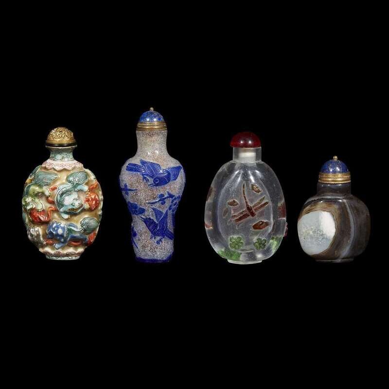 comprising an ovoid agate bottle with lapis lazuli stopper; a molded porcelain 'shi shi' bottle; a Peking snowflake glass cobalt overlay 'prunus and birds' bottle; and a two-color glass overlay 'butterfly and dragonfly' bottle.