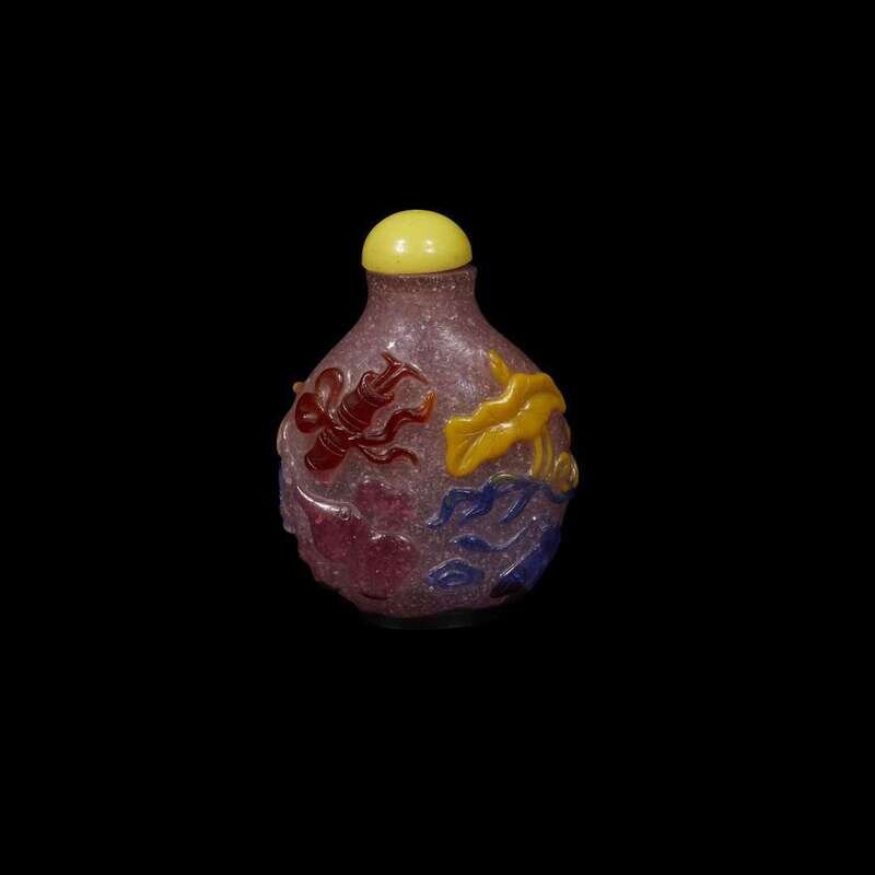 A Chinese five-color overlay glass 'eight daoist symbols' snuff bottle