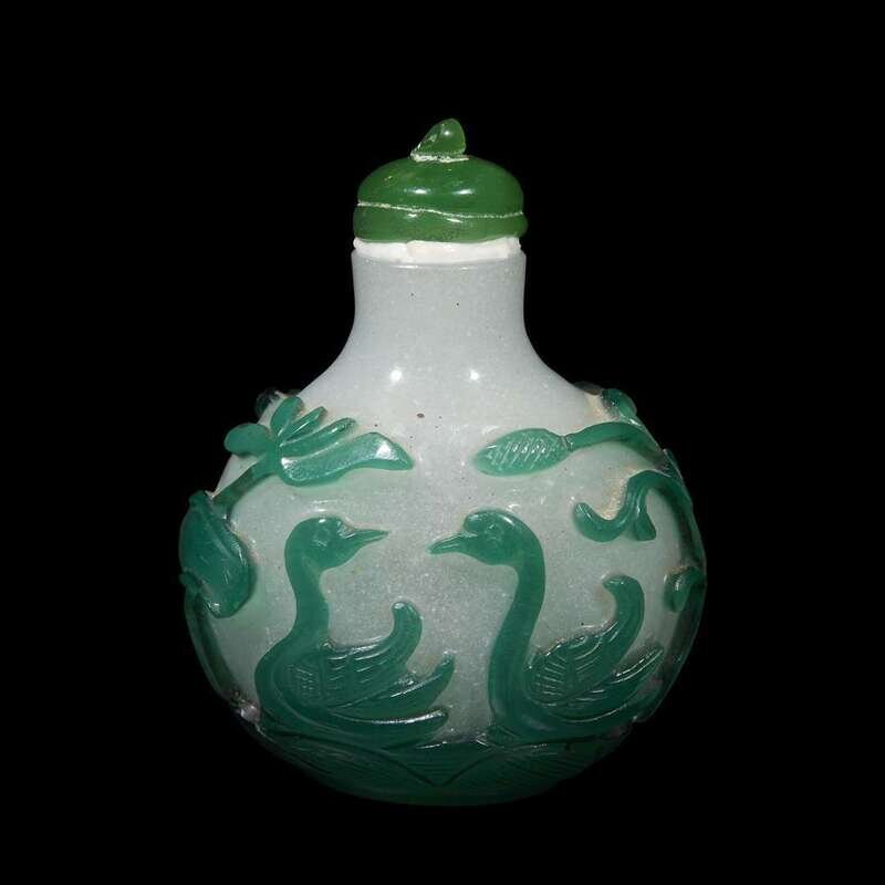A Chinese green-overlay white glass 'geese and lotus' snuff bottle