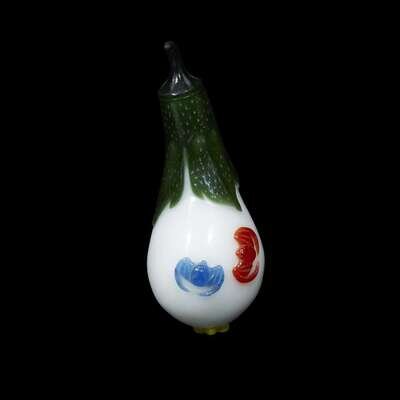 the gourd form with green leaves, a blue and a red bat, and a yellow floret at the base, green glass 'stem' stopper.