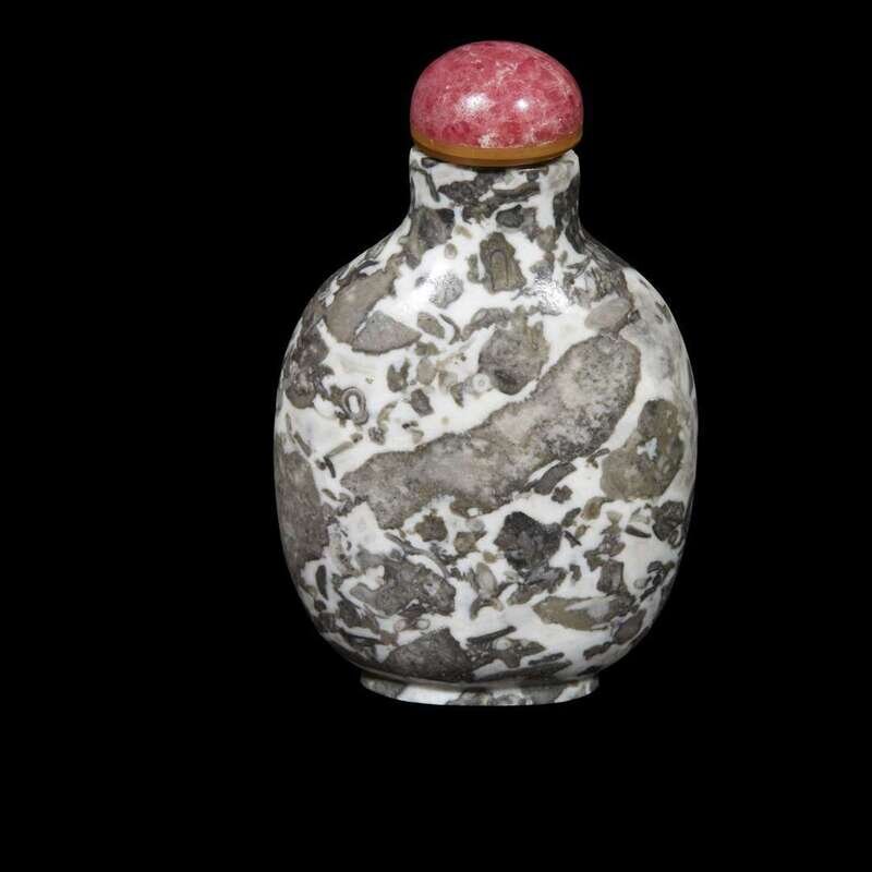 of rounded form, the stone with mottled grey inclusions within a white matrix.