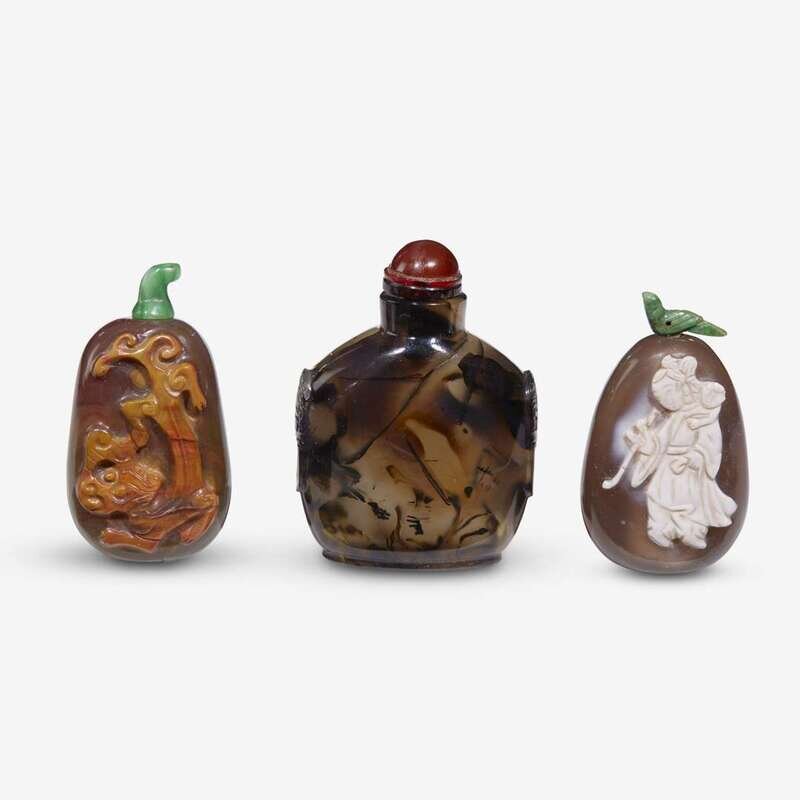 the first carved in relief, depiecting a stylized qilong; the second carved with lion-mask handles on the shoulder; the third of oval form, carved in cameo to depict a young man carrying a boy.