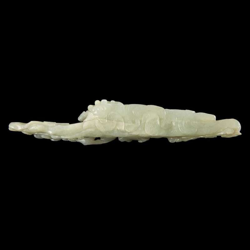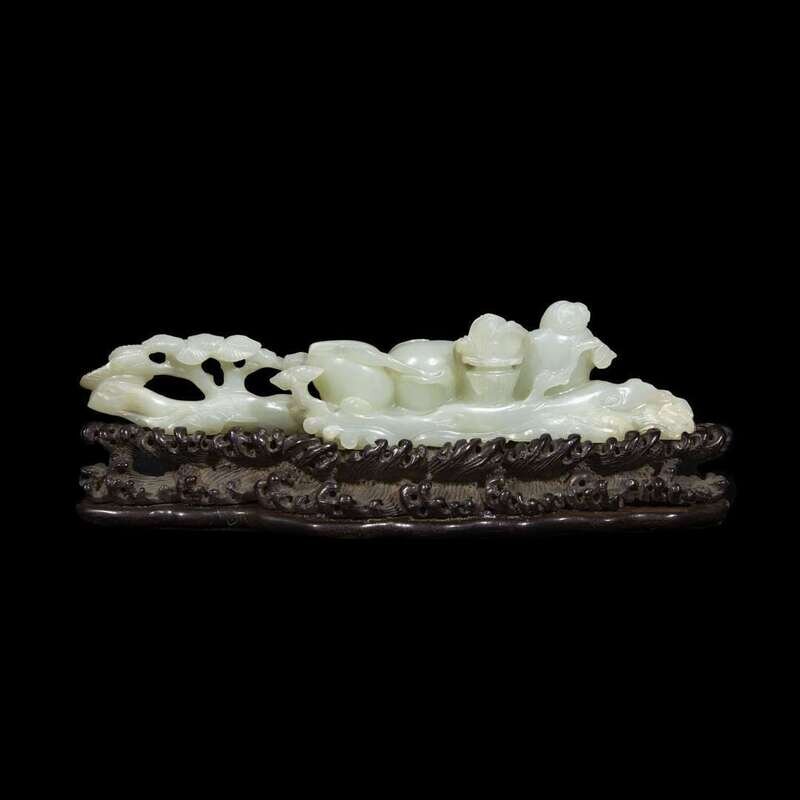 A Chinese celadon jade carving depicting boy with peaches on pine raft qing dynasty, 18th/19th century