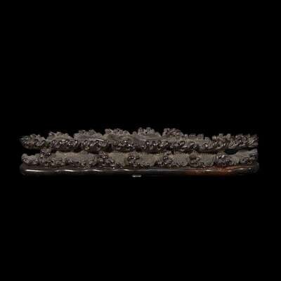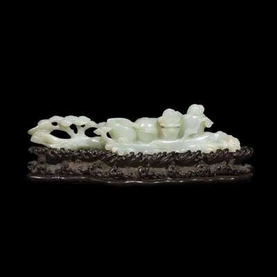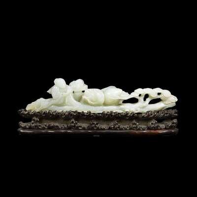carefully carved as a boy seated to the rear of the pine branch-raft with his body slightly turned to the left, both hands holding a lingzhi shaped tiller, beside him, two large peaches and a basket of smaller peaches, all on stylized turbulent water, the stone of a even celadon tone with scattered milky inclusions, fitted zitan stand carved as two layers of breaking waves.