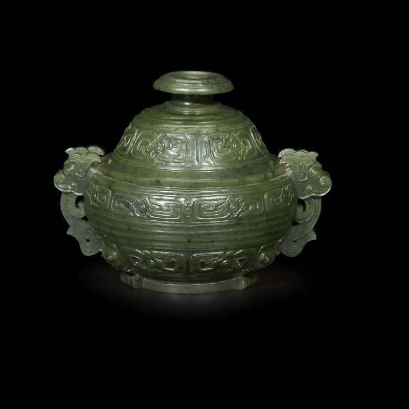 the compressed globular body flanked with two animal mask handles, each side carved with bands of archaic dragons, on three stylized feet, the domed cover similarly carved, surmounted with ring shaped finial, the stone of a spinach-green tone with dark green mottling.