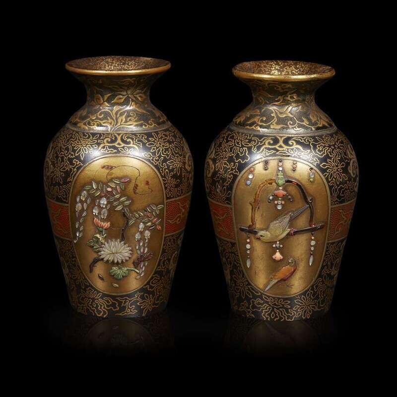 A pair of miniature Japanese Shibayama inlaid lacquer vases meiji period