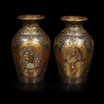 the pair of vases inlaid in typical manner with elaborate flowers and birds, both bordered by stylized floral designs.