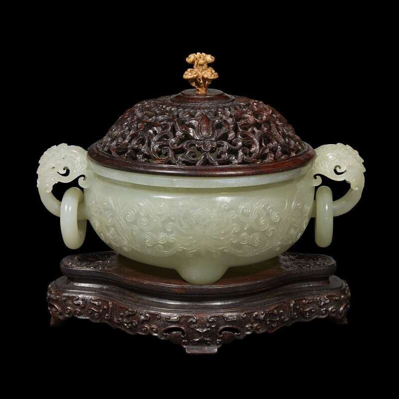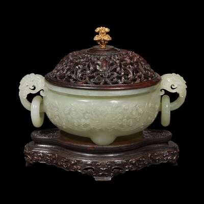 A Chinese pale celadon jade 'lotus' tripod censer and carved wood cover