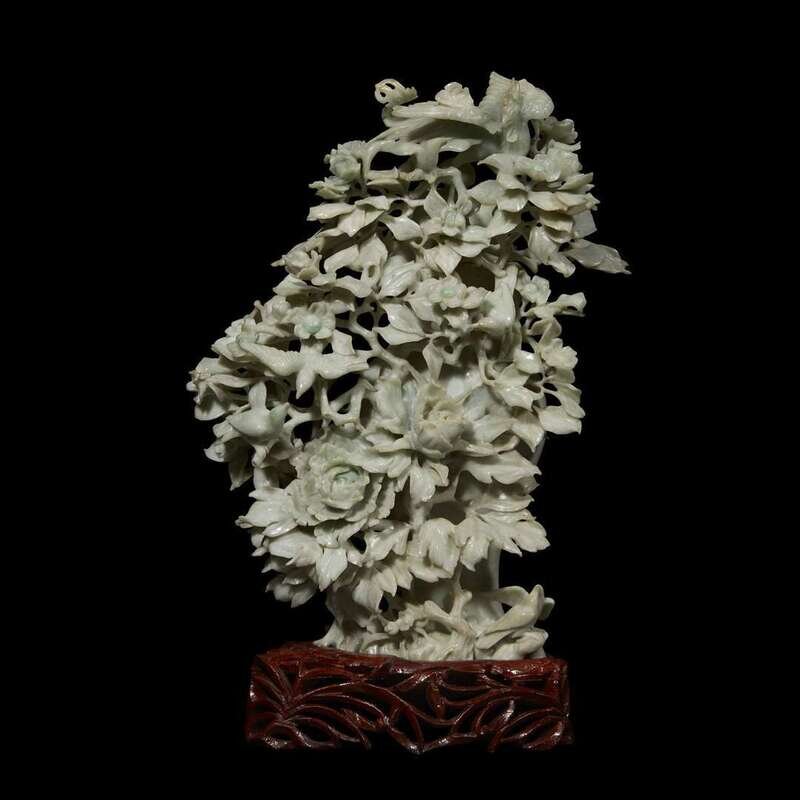 the flattened vase carved in high relief with luxurient peony branches, the flat cover surmounted by a phoenix with its tail extended to the rim of the vase, skillfully utilizing the apple green color of the stone in the center of the flowers.