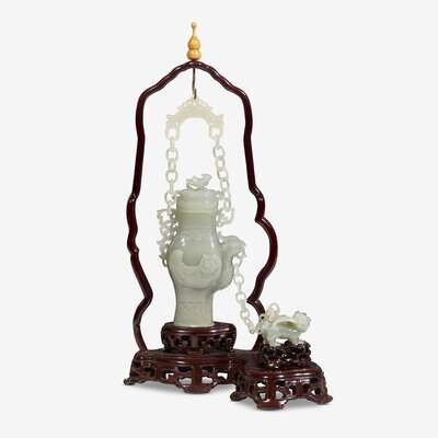 of pear shape body carved with an archaistic bird, hanging on a loose chain from a pierced 'chime' support, linked with a small carved fabulous beast, carved and pierced wood stand.