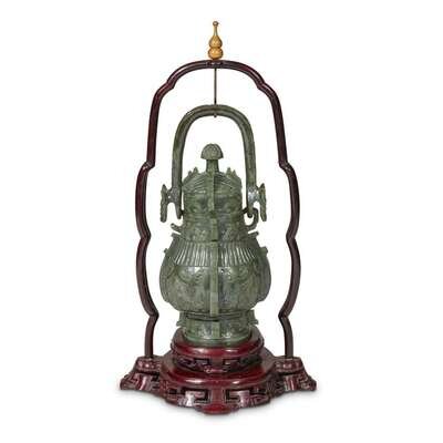 of archaistic form and decoration, with flanges and loop handle, wood stand.