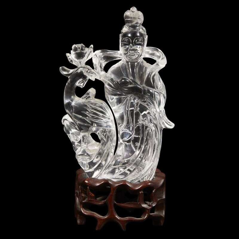 carved as a meiren dressed in long flowing robes, with her left arm raised and holding a fruit, accompanied by a phoenix standing on rockwork, with a branch of peony in its beak.