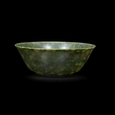 the deep rounded sides supported on a low foot, rising to a flared rim with a straight narrow outer edge, the stone with numerous sage green inclusions.