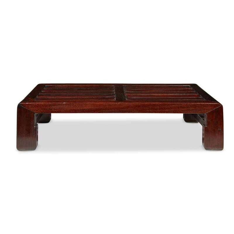 the rectangular slatted top raised on stylized 'hoof' legs.