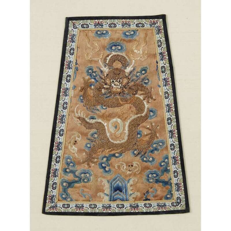 depicting a sinuous five-clawed dragon among clouds, flames and bats, later brocade borders.