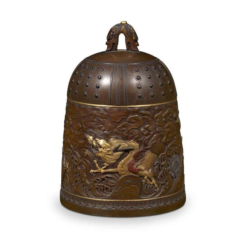 A fine Japanese bronze and mixed metal 'dragon' bell-form box and cover hattori studio, meiji period