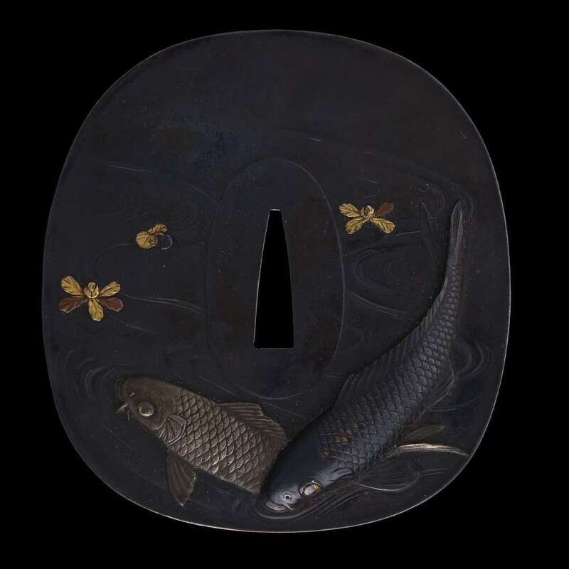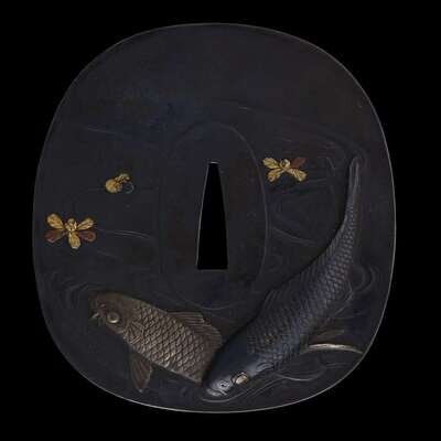 A Japanese iron and mixed metal 'fish' tsuba