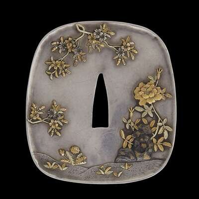 one side inlaid in gold, shakudo and copper with a pheasant under a cherry tree, while a eagle flys above, the other side inlaid with cherry blossoms, chrysanthemums and rockwork.