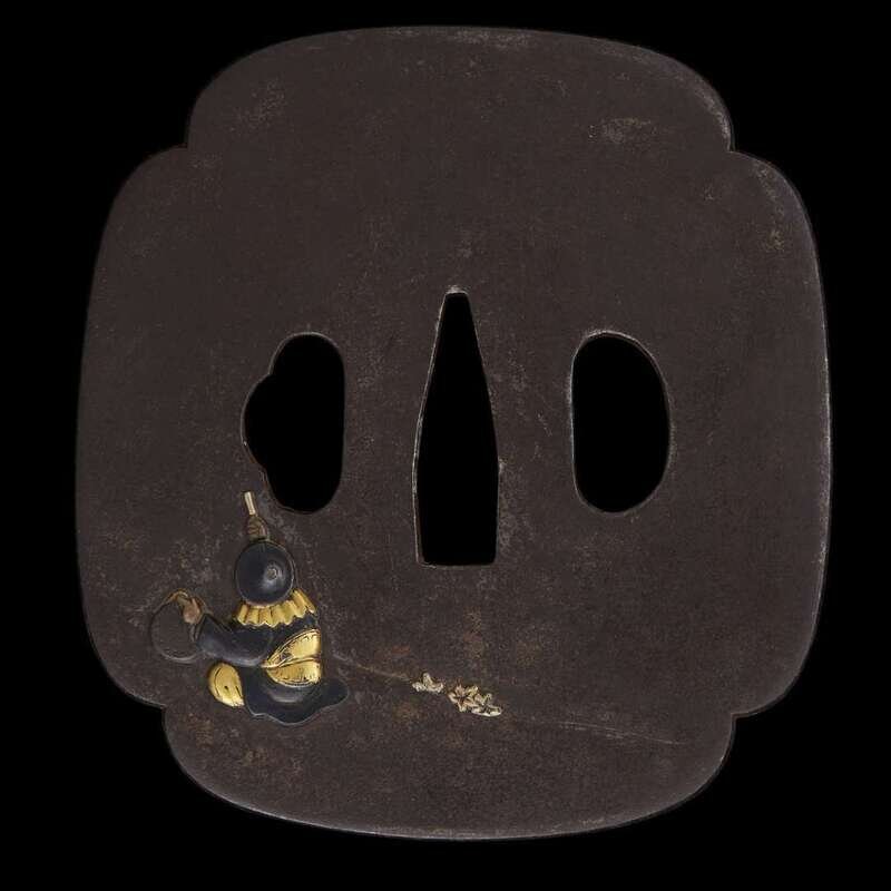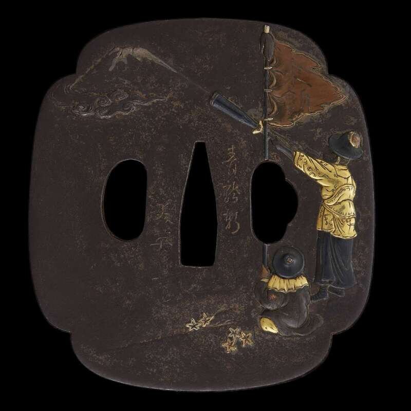 A Japanese gilt and iron 'figures and flags and mountain' tsuba