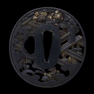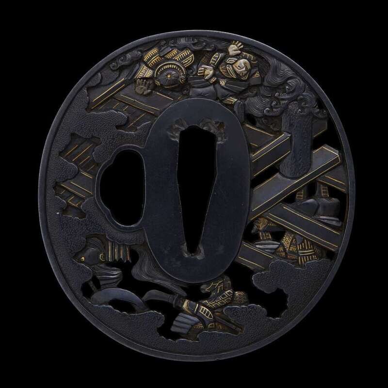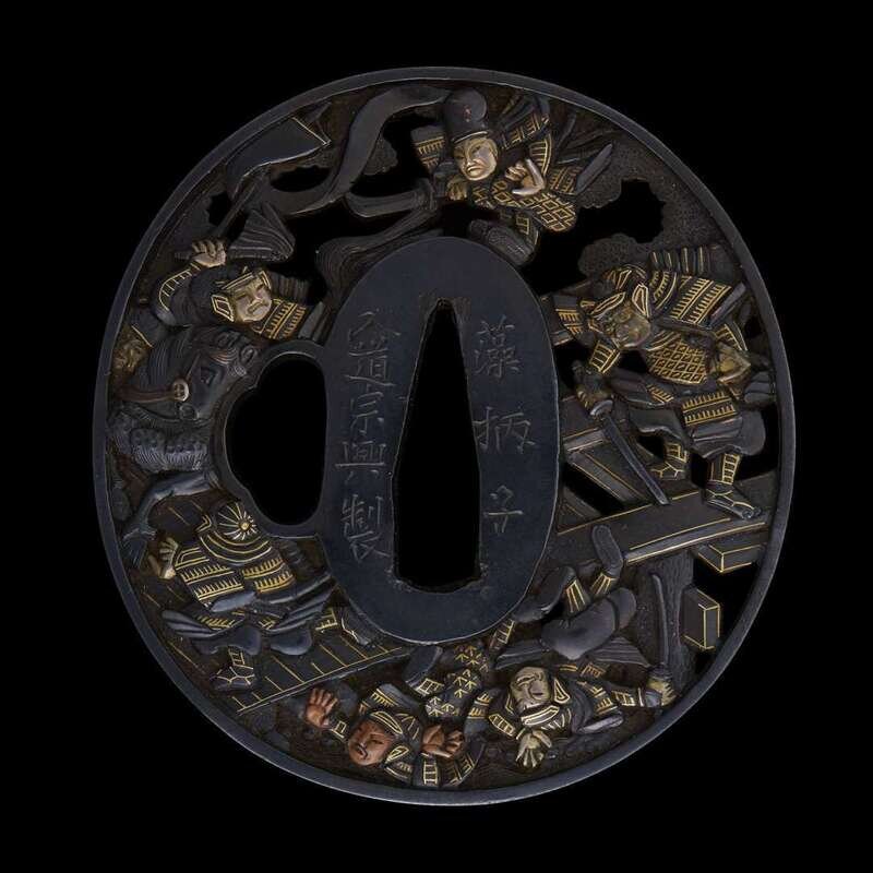 of circular form, pierced and decorated in mixed metal and gilt with six assorted samurai figures on a bridge, the reserve with another two, signed Soheishi Soten.