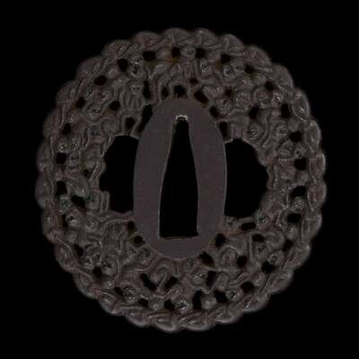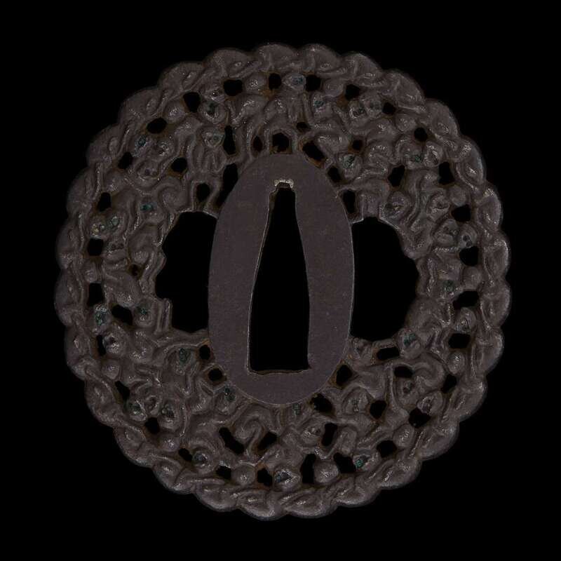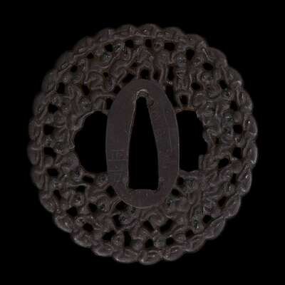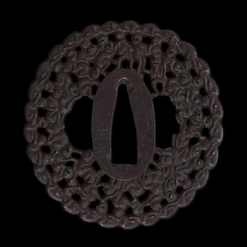 the circular tsuba with scalloped edge, comprising numerous monkeys, signed Busita Masakata.