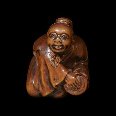 A small Japanese wooden netsuke of a kneeling figure signed minkoku, 19th century