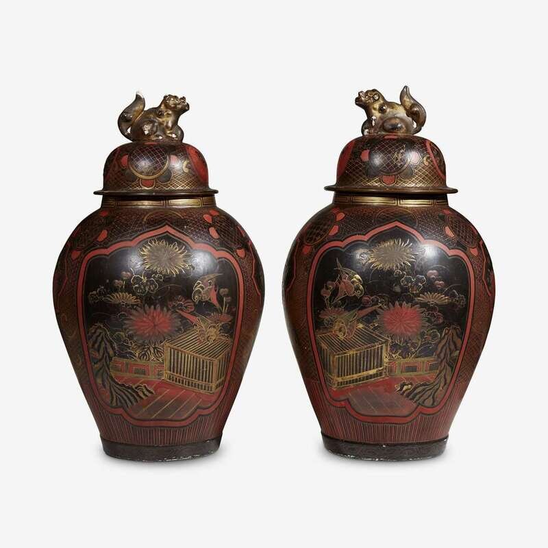 of ovoid form, the domed covers surmounted with shishi finials, each vase decorated in black, red and gold lacquer with birds and flowers.