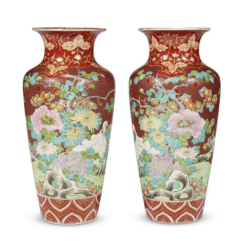 Vasiform, decorated with peony, chrysanthemum, daisy, hawthorn branches and magpies, against a rich dark iron-red ground, bordered by stylized scroll and pattern designs.