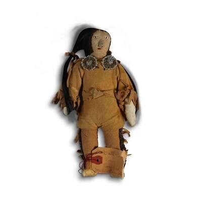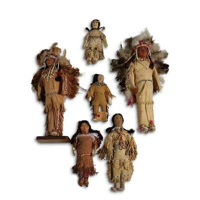The first, of hide with beaded eyes and mouth, felt nose, with hand-written paper tag: "Real hair Rosebud Sioux Mattie Faun Generation"; the second, of hide with embroidered features; the third, of fabric with embroidered features; and the last three, each with hand-painted molded leather face.