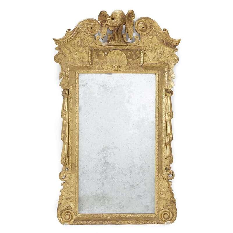 Of rectangular form, with swan's neck pediment ending in rosettes, centered by an eagle above a rocaille shell, the mirror plate flanked with swags, scrolls, and foliate devices.
