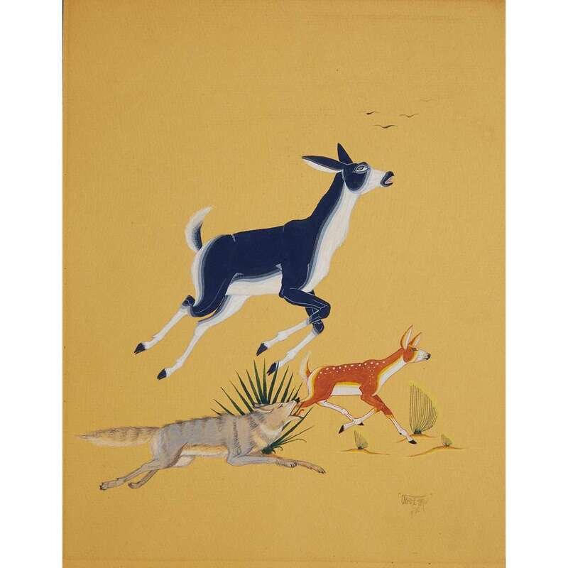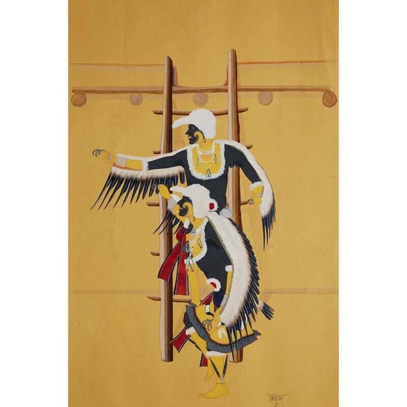 Comprising "Eagle Dancers" and "Retreating Fawns" by Manuel Chavez (Ow-U-Te-Wa), Cochiti Pueblo, Pena Blanca, N. Mexico, signed and dated, lower right, "Ow-U-Te-Wa 40"; "Buffalo Dancer" by Camillo Swazo and "Delight Maker" attributed to the same artist; "Deer Dancers Tesuque," signed lower right, "Wo-pee II Diego Herrera"; a gouache on paper with three figures walking in ceremonial garb; and three works signed by Justin(o) Herrera, Cochiti Pueblo, one framed.