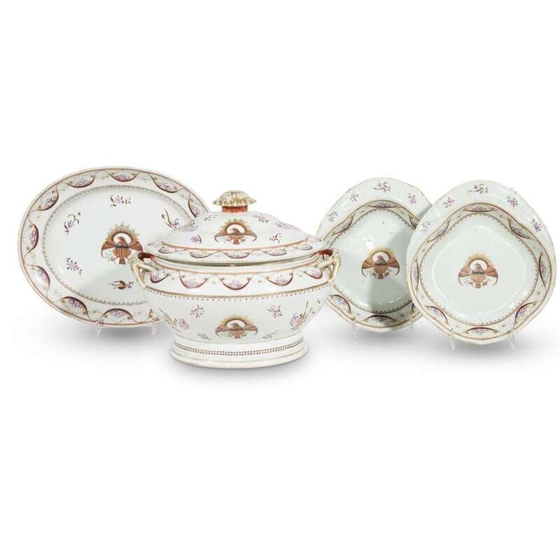 Decorated with an emblazoned American Eagle and pink floral swags; together with a conforming pair of shrimp dishes.