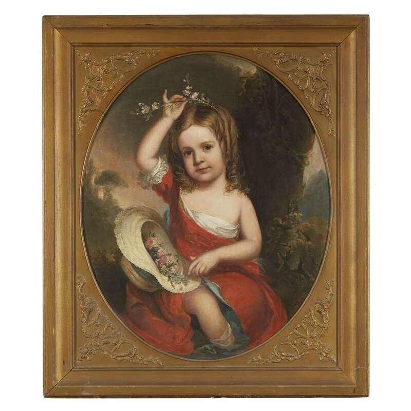 Manuel De Franca (1808-1865) Portrait of a young girl in a red dress holding a straw hat filled wit