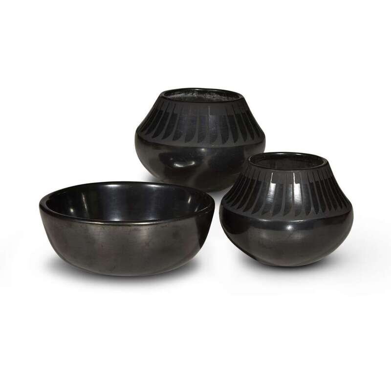 Each with band of feathers along shoulder, signed to underside, "Marie + Santana;" together with a polished blackware bowl, signed to underside, "Santana Adam. "
