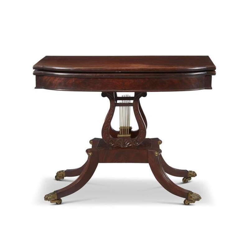 Classical carved mahogany and brass lyre-base card table Philadelphia, PA, circa 1820