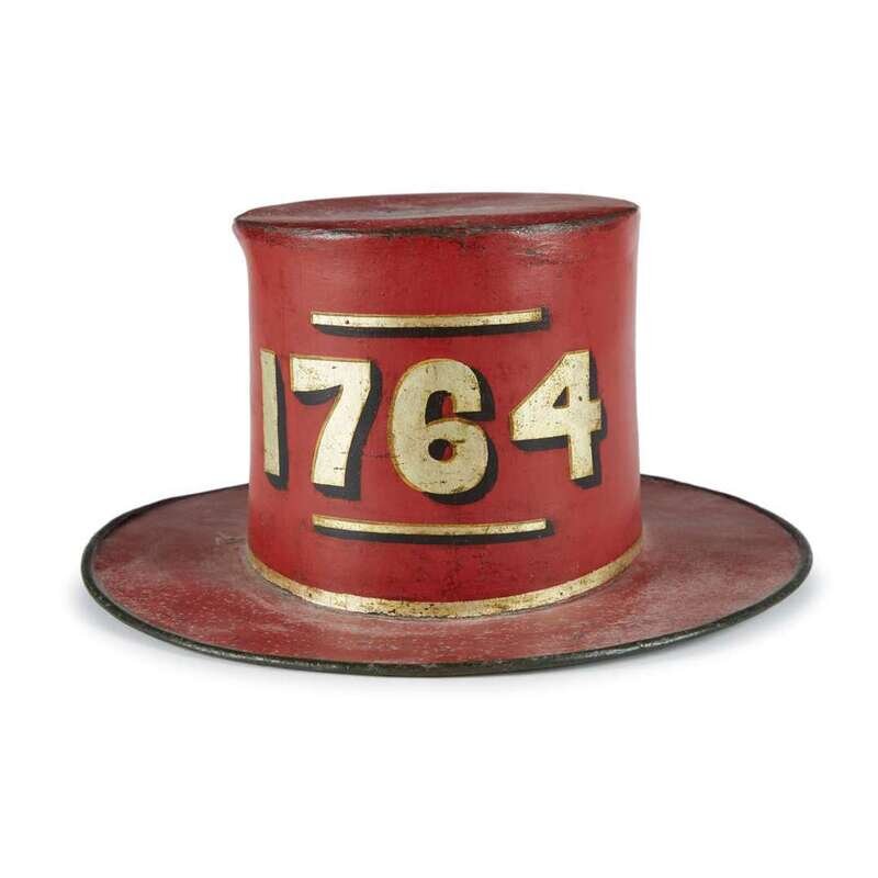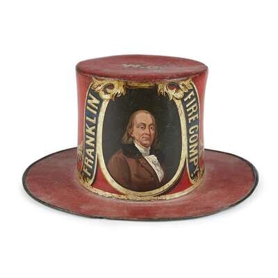 The red ground decorated with polychrome portrait of Benjamin Franklin within a bannerette inscribed, "Franklin Fire Comy," embellished with gilt foliate flourishes, the back bearing the gilt date, "1764"; the top with gilt initials "W.G."; the hat numbered "92" on the inside band, underside of brim painted green, retains paper liner and leather inner brim.