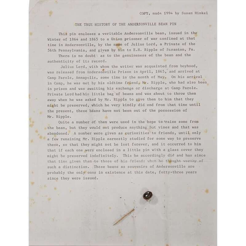The bean mounted in glazed stick pin; together with a typed account of Ripple's internment at Andersonville Prison.