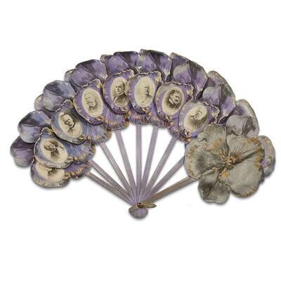 The first fan, having painted sticks and guards, is printed with three scenes depicting the sinking of the USS Maine in Havana Harbor, February 15, 1898; known as the historic event which was the catalyst of this war. The second fan, (with lavender dyed sticks, and leafs shaped as pansies) each of which pictures a celebrated individual closely involved with progression of the conflict and/or its resolution: President William McKinley, Admiral George Dewey, Army/Navy Commanders Nelson Miles, William Sampson, Winfield Scott Schley, Charles D. Sigsbee, John Davis Long and Governor Wesley Merritt.