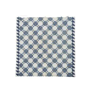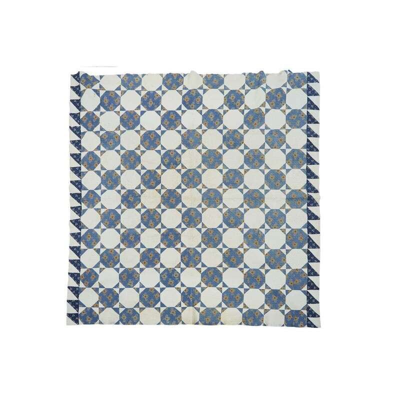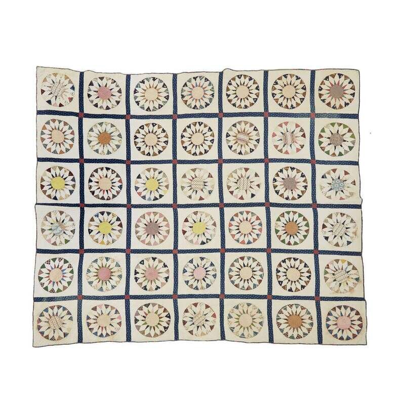 The "Sunburst" quilt worked with variously colored printed patches on a muslin ground heightened with diamond quilting; the pieced "Snowball" pattern quilt, circa 1830, comprised of printed blue and muslin patches heightened with diagonal quilting.