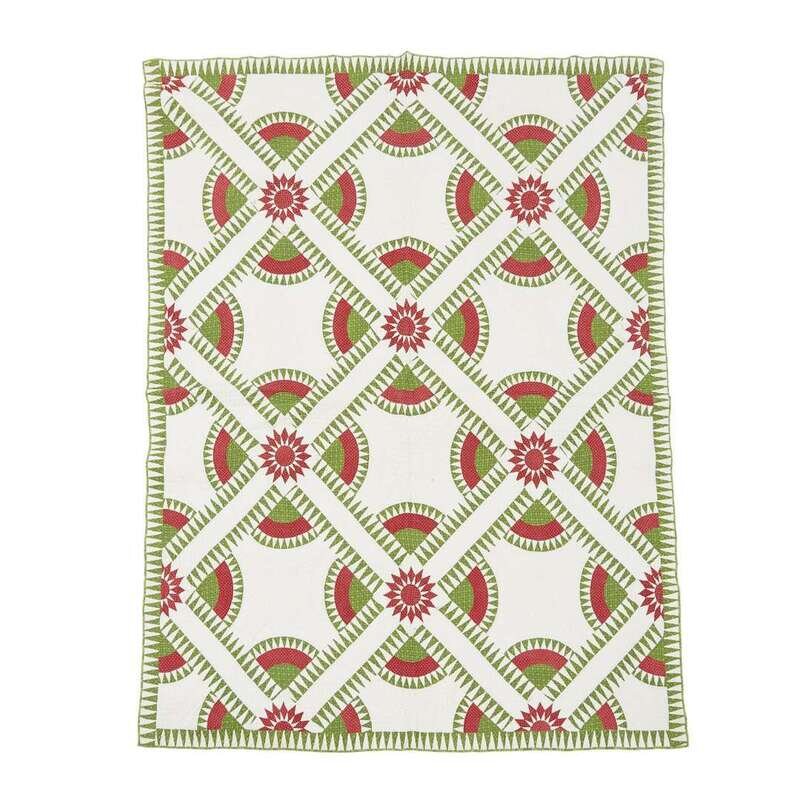 Worked with printed red and green cotton pieces on a muslin ground and heightened with feather and parallel line quilting.