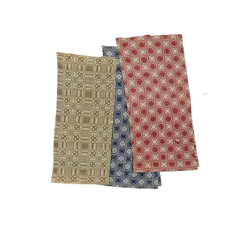 Sophia Caroline McLin, mid to late 19th century Each comprised of two panels, two coverlets in "Sunflower" or "Ladies Delight" pattern: the first, in navy blue wool and natural cotton and the second, in red and natural cotton; together with "Double Bow Knot Flourishing Wave" pattern in olive green wool and natural cotton.