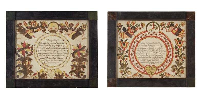 tury Comprising a birth certificate for Andreas Mohr, son of Catharina and Wilhelm Mohr, born February 14, 1804, and a birth certificate for Henrich Schiffert, son of Jacob and Maria Charlotte Schiffert, born April 25, 1771, watercolor and ink on paper, framed.