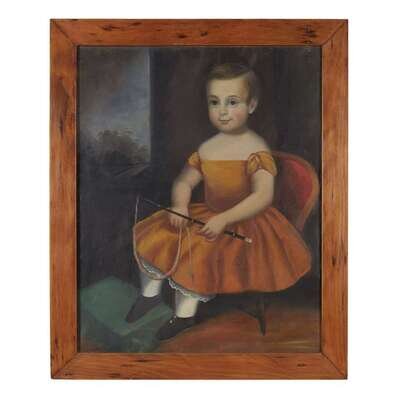 American School 19th century Portrait of a young boy in persimmon dress seated in a red chair and h
