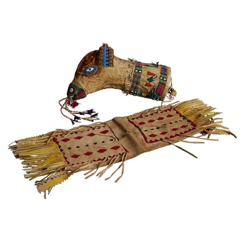 In the form of a bison calf's head ornamented with quilled streamers and tin cone bells, with hand-written tag identifying maker; together with a hide double pouch with geometric cut-outs backed with red and blue cloth, yellow dyed fringe.