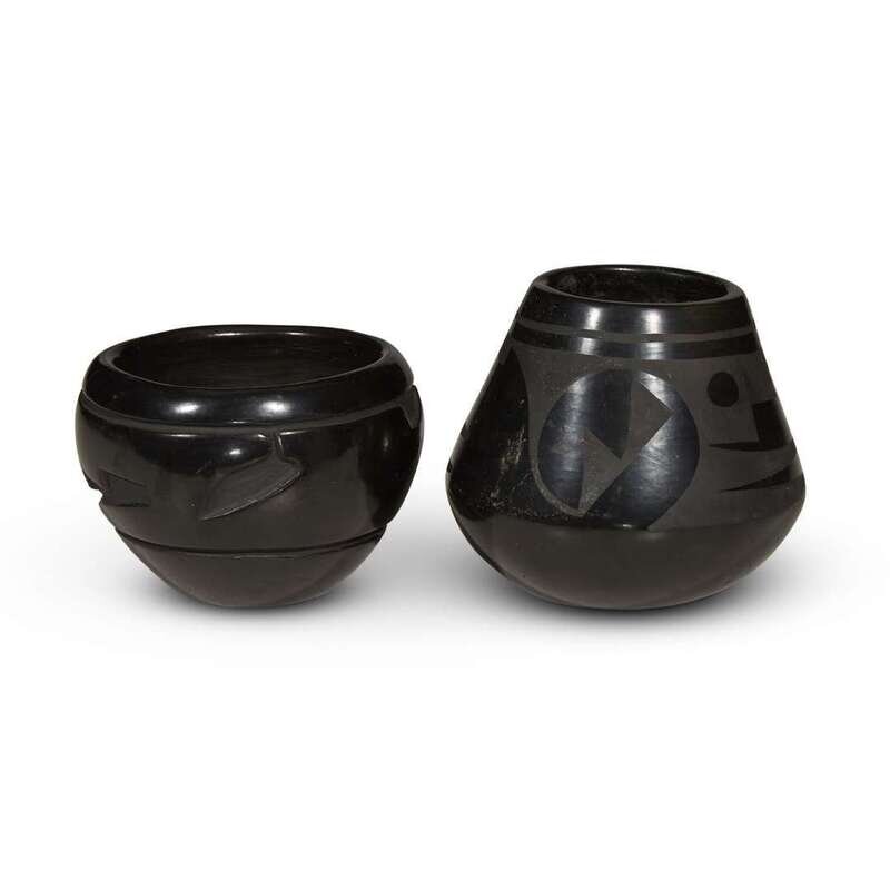 The first, with carved geometric design, signed to underside, "Frances"; and the second, with black-on-black geometric motif, signed to underside, "Pablita Sta Clara."