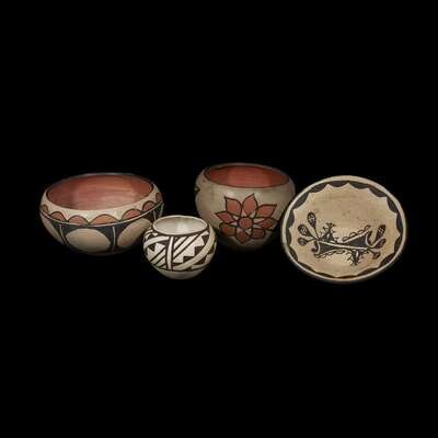 Comprising a pictorial Santo Domingo storage jar, decorated on each side with a flower; two Santo Domingo bowls, one with central abstract design; and an Acoma small jar with geometric design.