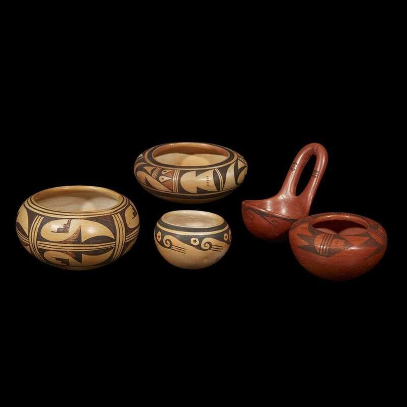 Two signed by "Patricia Honie," the others by "Laura Tomosie," and "Fannie Nampeyo," respectively; together with a Hopi ladle with indecipherable signature.