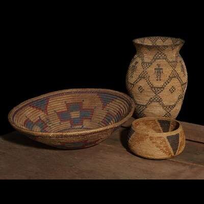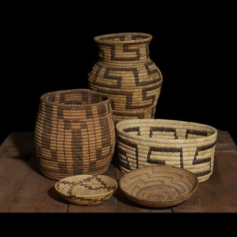 Including a large Jicarilla Apache polychrome wedding basket; an Apache figural olla; a Tohono O'odham (Papago)/Pima olla, with hand-written note, "Made by Josie Johnson Papago" and an oval basket; a Pima cylindrical storage basket; a Mission polychrome basketry bowl; and two small coiled baskets with geometric design.
