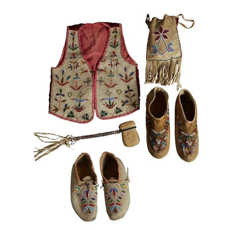Including two pairs of beaded Santee Sioux moccasins, a beaded hide vest, a carved tomahawk with beaded handle, bearing hand-written label,"Stone Hammer Yankton Sioux."